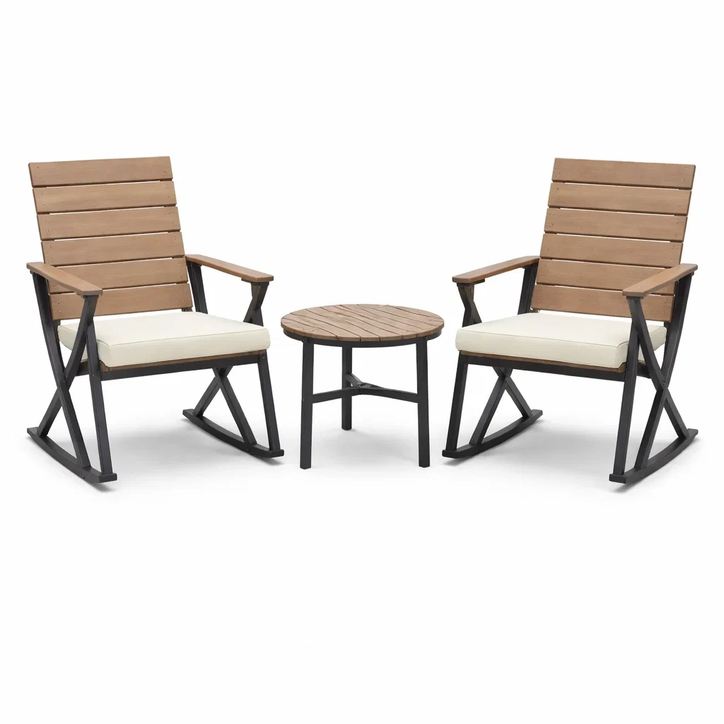 Materiale:Sedie a dondolo con struttura in acciaio, seduta e schienale in legno composito e cuscini in poliestere;tavolino in acciaio con piano in legno composito
