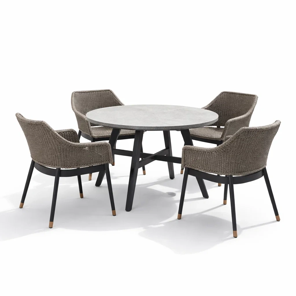 Materiale: Tavolo in cemento; sedie in rattan sintetico con struttura in alluminio