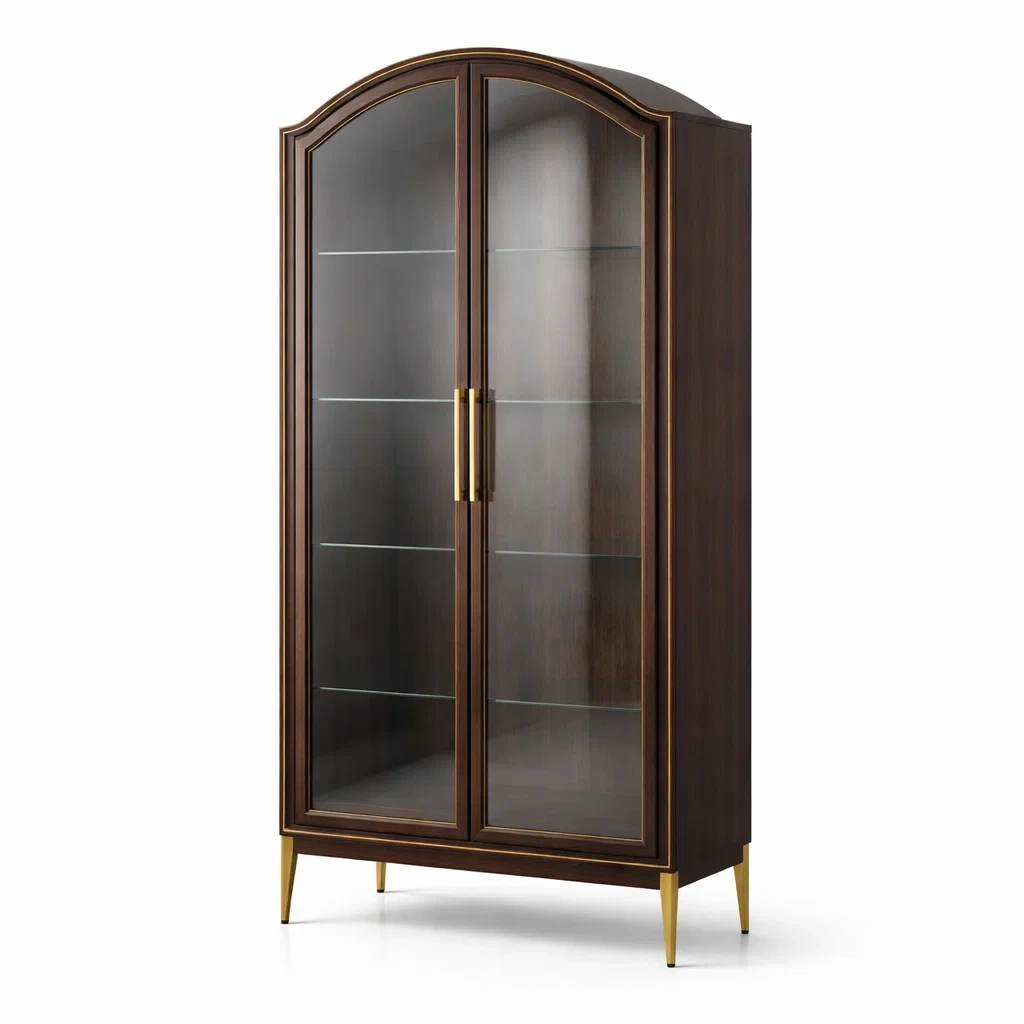 Materiale: Struttura principale in legno scuro, porte in vetro temperato, maniglie e gambe in metallo dorato